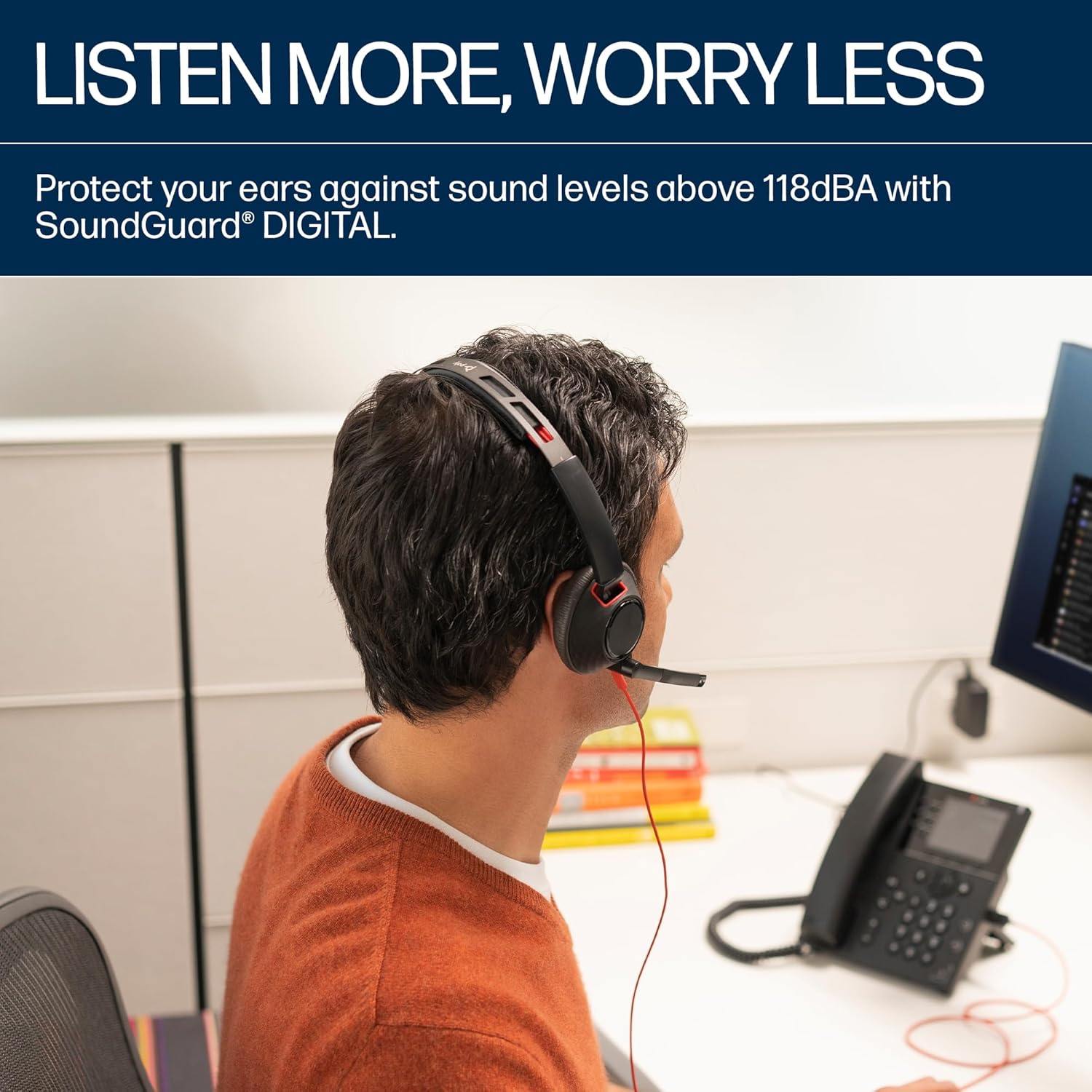 The Blackwire 5220 wired headset with flexible boom microphone fits perfectly into your busy workday and is ideal for desk-based professionals who need a hands-free PC or mobile communication headset at the office, at home, or both. Easy to use, the Blackwire 5220 features USB-A and 3.5 mm connectivity that lets you work on a variety of devices, including PC or Mac, tablet, or smartphone. This dual-ear wired computer headset’s noise-canceling microphone ensures callers hear your voice—not your surroundings, while audio automatically switches between telephone wideband and hi-fi stereo for multimedia and music. What’s more, SoundGuard DIGITAL technology protects against high sound levels, sudden loud noises, and long-term sound exposure for a reliable and enjoyable audio experience. Durable and ergonomically designed, this computer headset features ultra-soft leatherette/memory foam ear cushions and a lightweight, adjustable headband that ensures a custom fit you can comfortably wear all day, even on your longest calls. Intuitive inline controls let you answer and end calls, control volume, and mute your mic for simplified call management. The Blackwire 5220 wired stereo headset also features plug-and-play compatibility with Microsoft Teams, Zoom, and other leading collaboration platforms for trouble-free online meetings whether you’re at home or the office. The power to connect and work easily is here.