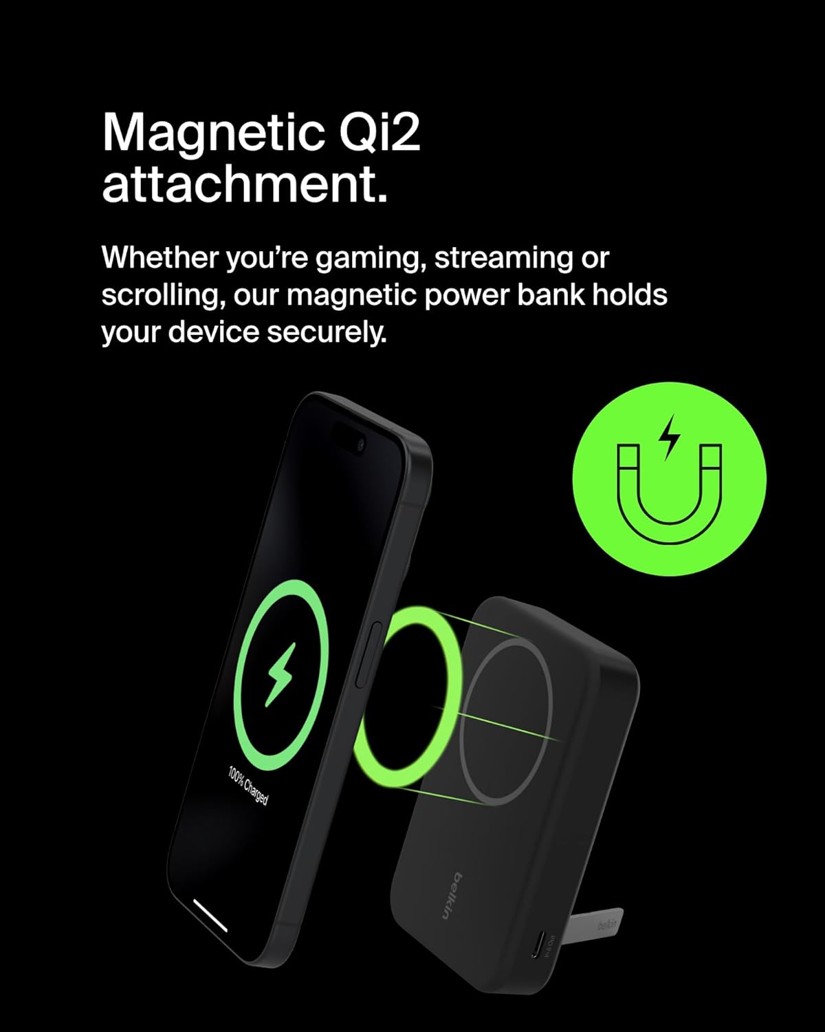 • Magnetic Qi2 attachment plus integrated kickstand: Whether you're gaming, streaming or scrolling, our magnetic power bank holds your device at the perfect angle for viewing without a clip or mount to cover any part of your screen. A built-in kickstand allows you to view your screen while you continue to surf the web or take calls.
