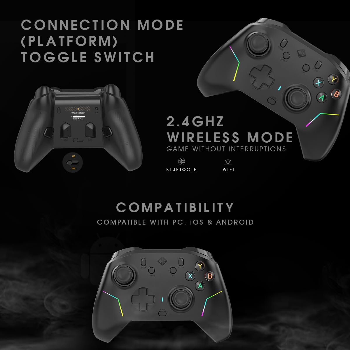 • Tri-Mode Connectivity – Play on 2.4GHz Wireless (USB dongle), Bluetooth 5.3, or USB-C wired. Compatible with PC (XInput/DInput), Android, iOS (MFi-supported)
