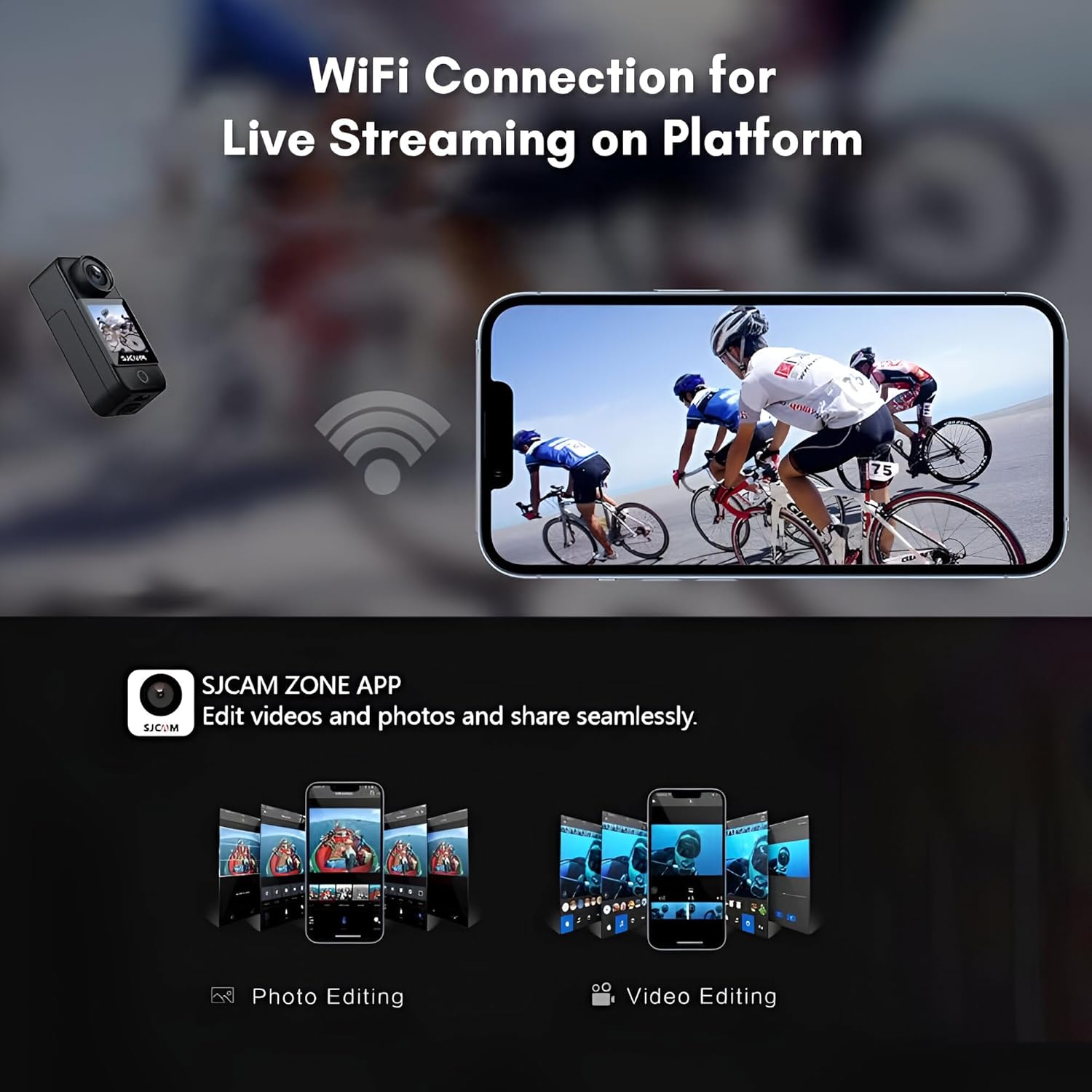 • 【Not Just Action Camera】: It's not just an action camera, but also a single-screen selfie camera and a touch dual-screen camera. This camera is equipped with improved 5G Wi-Fi, After connected, the camera's content can be viewed, set up and downloaded in real-time through "SJCAM Zone" APP. It can also act as a network live stream camera by connecting to home Wi-Fi. and use as a dash cam or Vlog camera.
