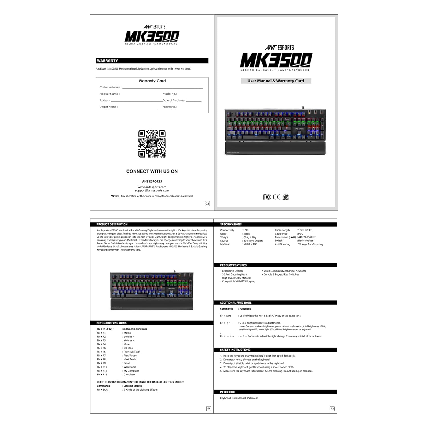 • 104 Keys Anti-Ghosting Programmable: MK3500 mechanical gaming keyboard features Anti Ghosting Technology which ensures your simultaneous keystrokes register the way you intended, allow multi-keys to work simultaneously with high speed. Each key is controlled by independent switch, let you enjoy high-grade games with fast response, boosting your performance. The PC Gaming Keyboard has been ergonomically designed to be a superb typing tool for office work as well