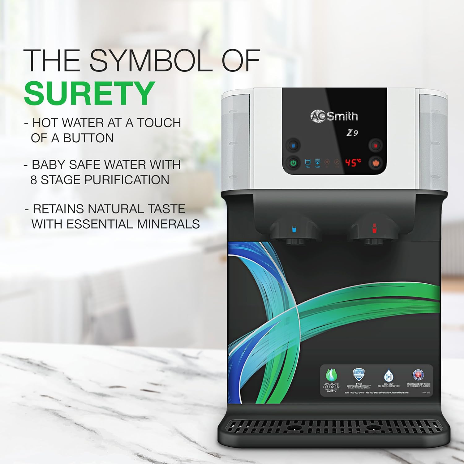 • 100% RO+SCMT Purification : AO Smith Z9 Hot+Normal Filter Water Purifiers double protection of RO (Reverse Osmosis) and SCMT (Silver Charged Membrane Technology) guarantees baby safe drinking water. It cleanses the water as an additional advanced SCMT filter, compared to other RO UV UF water purifiers, preventing any potential secondary microbial contamination against phosphates, chemical reduction, cysts, colloids, particulates, endotoxins etc.