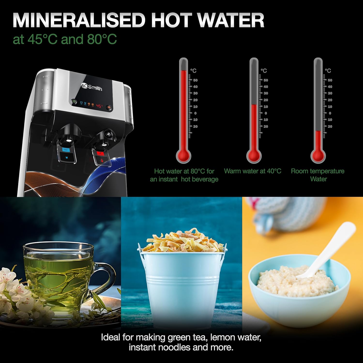 • Instant Hot Purified Water: At the tap of a button pick the temperature mode of your choice. Ranging from ambient/room temperature to warm (45°C) and (80°C) hot water, equipped with child lock protection from hot water. This water purifier & filter does not have cold water dispensing