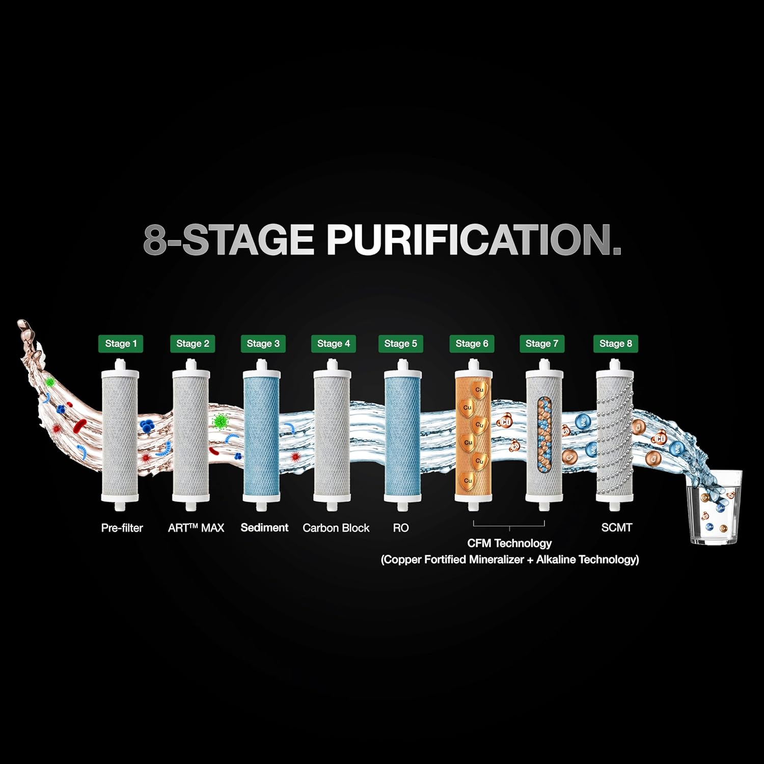 • 8 Stage Purification: This advanced system provides your family with purified baby safe drinking water. The Patented Side Stream RO Membrane ensures 100% water that filters through is safeguarded from chemical impurities, viruses and bacterias, complemented with the Dual Filter of SAPC & SCMT that enhances the overall quality of the water