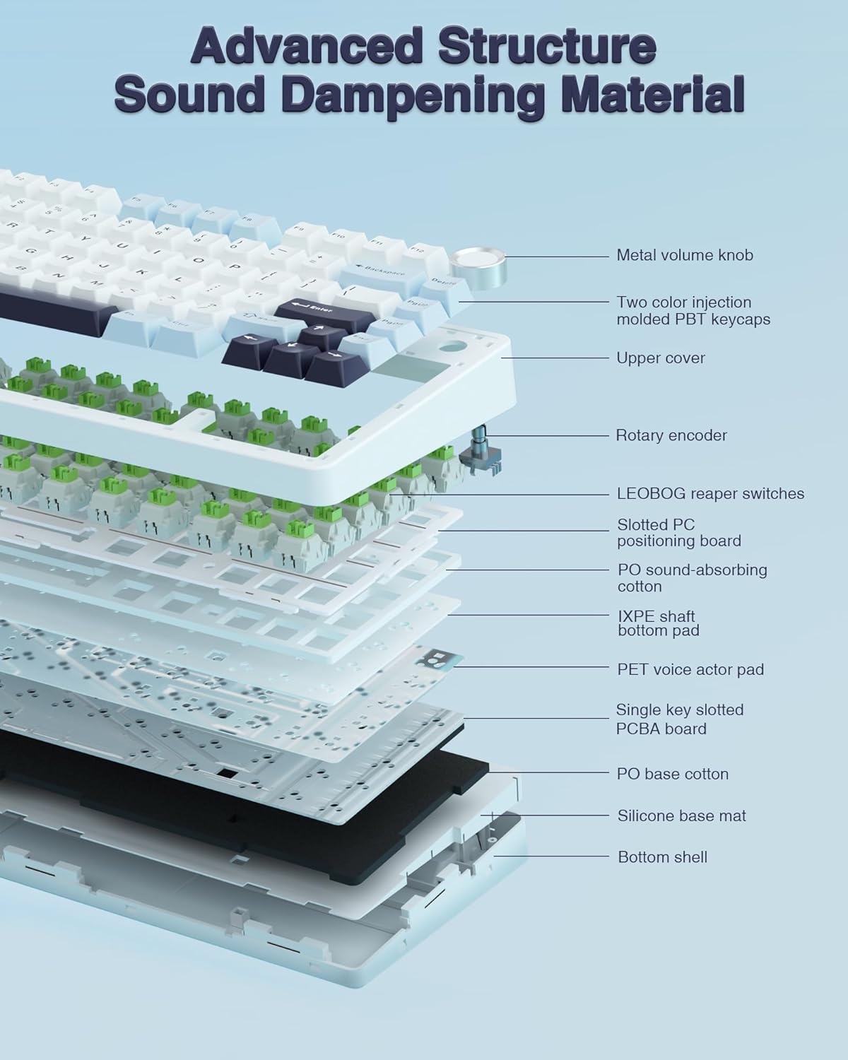 • 【Hot-swap Custom Keyboard】This custom mechanical keyboard with hot-swappable base supports 3-pin or 5-pin switches replacement. Even keyboard beginners can easily DIY there own keyboards without soldering issue. F75 gaming keyboards equipped with pre-lubricated stabilizers and LEOBOG Reaper V3 switches, bring smooth typing feeling and pleasant creamy mechanical sound, provide fast response for exciting game.