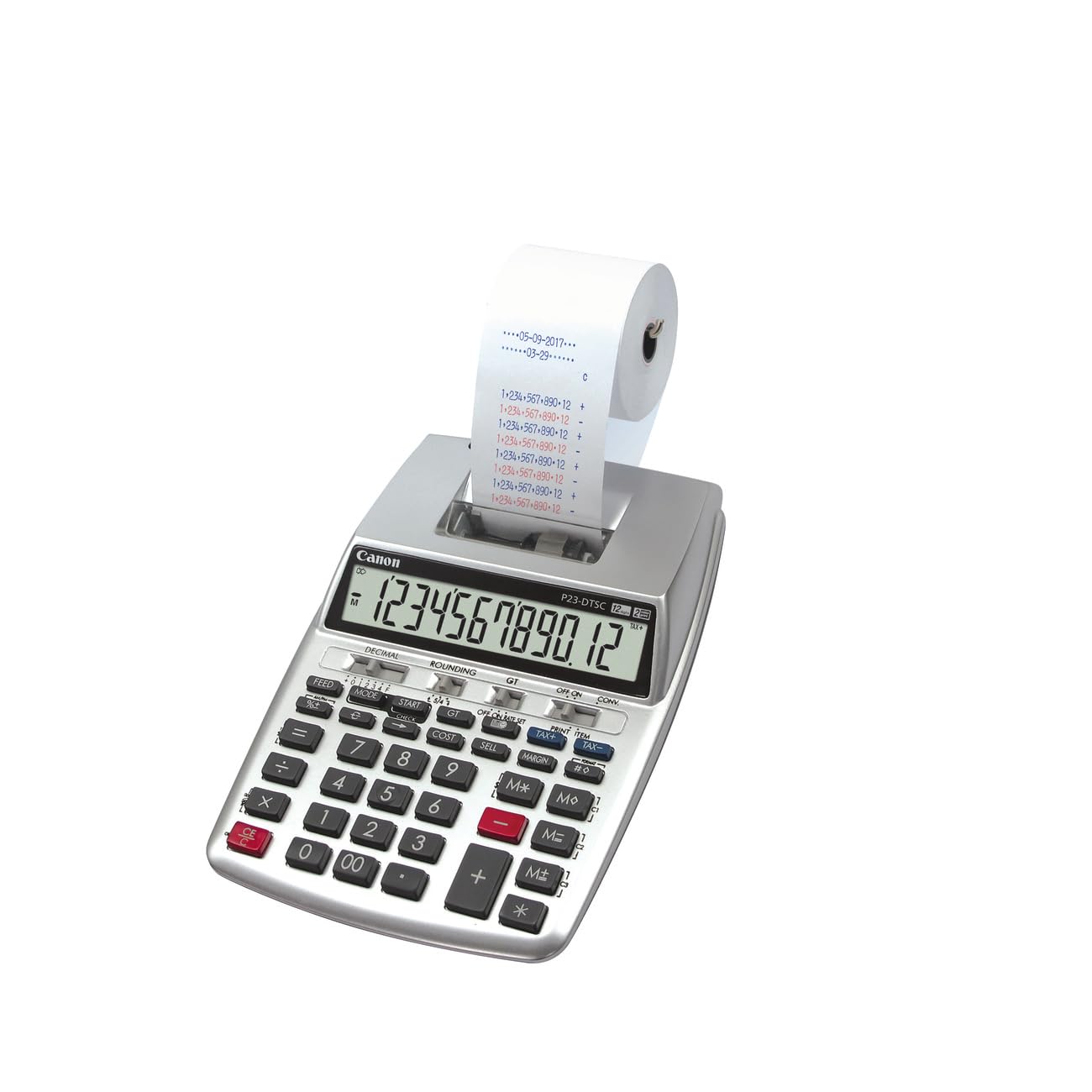 The Canon P23-DTSC II Printing Calculator is a compact, high-performance tool built for business professionals who need reliability and speed. Equipped with a 12-digit LCD display and 2-color ink roller printing, it handles all your accounting, tax, and business calculations with clarity and precision. Whether you're calculating taxes, margins, time, or currency conversions, this calculator simplifies your workflow. The fast print speed of approx. 2.0 lines per second and dual-color printing (blue and red) make it perfect for clear documentation and financial records.