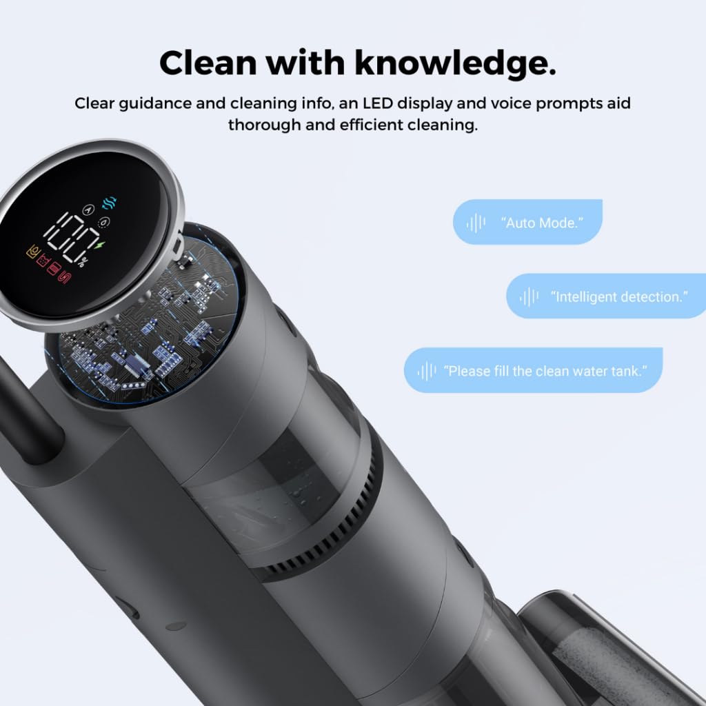 • Intelligent cleaning of hard floors - The Dreame H12 Core sensor identifies the difficulty of soiling and adjusts suction and water flow. It effectively treats all dirt, powders, liquids, hair, without wasting time. A bright LED display clearly shows cleaning status and operating mode, while helpful voice messages inform you about your device so you can get the most out of every cleaning session.