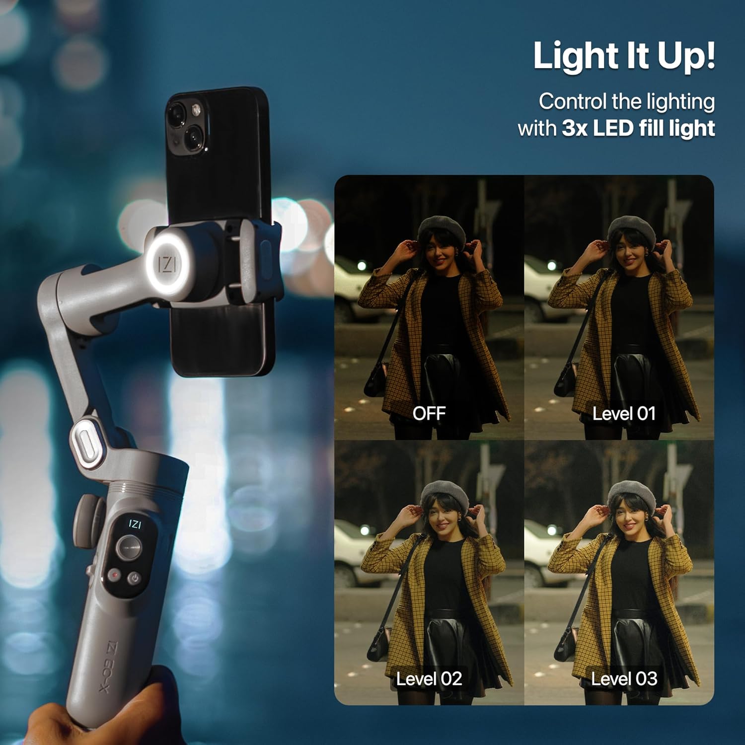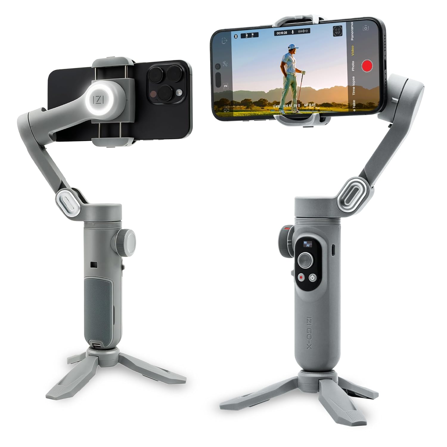 IZI GO-X Mobile Handheld Gimbal Stabiliser, 3-Axis, OLED Display, LED Fill Light, Wireless Charge Pad, Android, iPhone, Live Video, Instagram, YouTube, Shot Guide, Smart AI Track, Portable Gimbal. (UNBOXED) 🥇