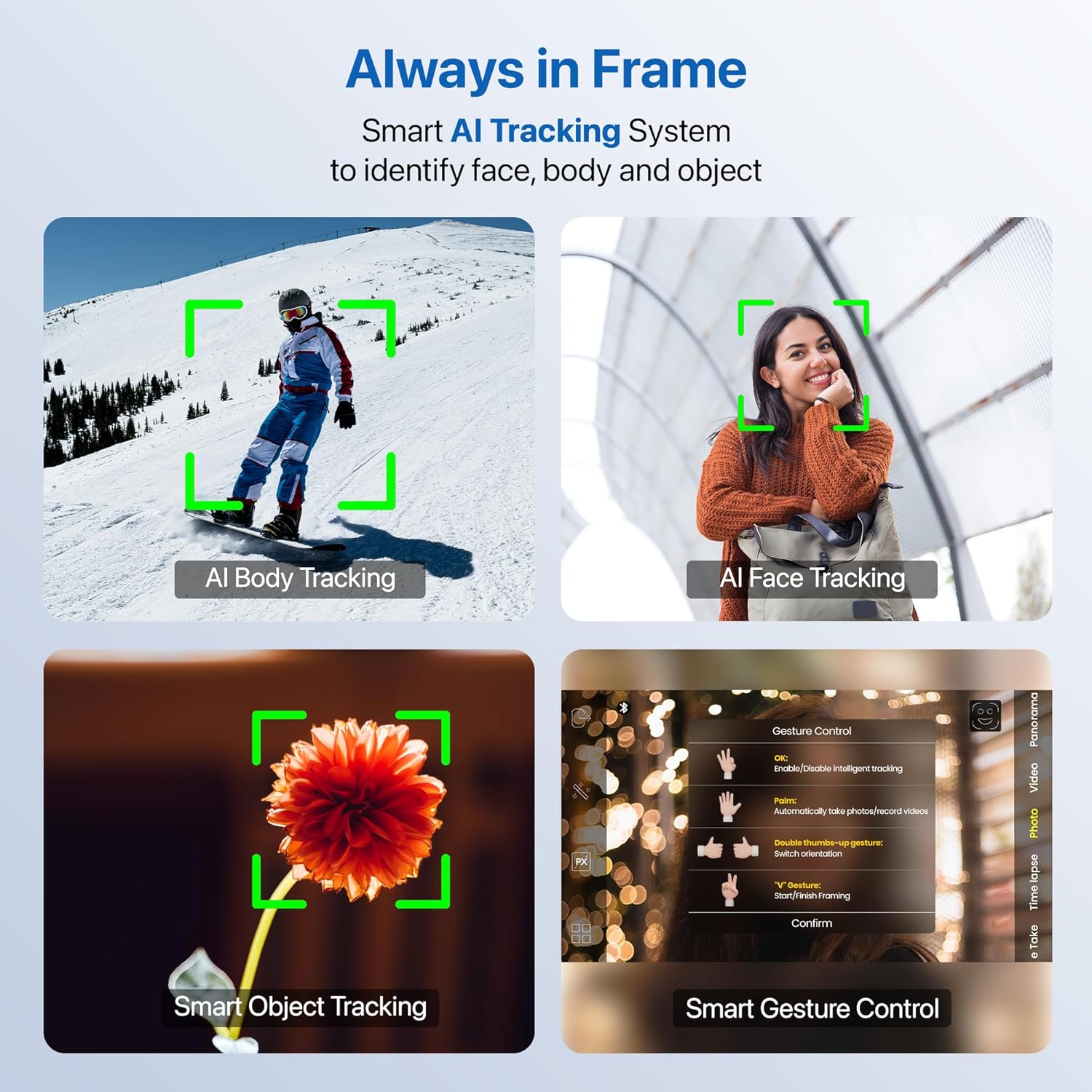 • Gimbal Stabilizer with Smart AI Modes, Effortless Control: Empower your filmmaking with intelligent modes like Face Track, Time-Lapse, Slow Motion, and more. Adjust focus speed and control zoom effortlessly. Live stream with confidence and create content like a pro.