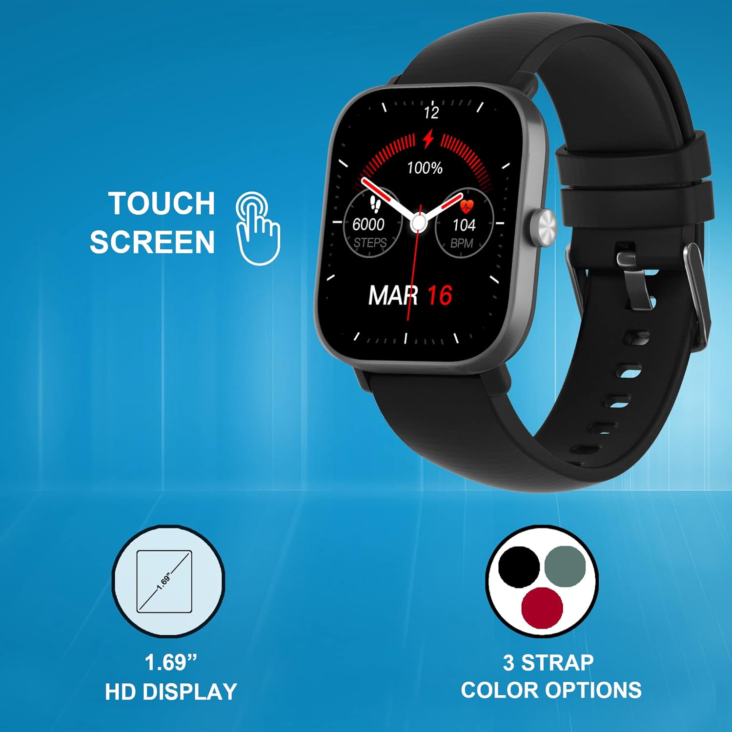 • ?? 1.69" HD DISPLAY: Get the smart viewing experience on the 1.69" LCD display;?? 120+ SPORTS MODE: Take your pick from a wide range of 120+ sports modes; ?? 150+ CLOUD-BASED MULTI WATCH FACES: Experiment with your fit. Choose from a plethora of watch faces and complete your look for the day.;?? SpO2 TRACKER (High accurate sensor): Chronic low blood oxygen levels can lead to serious health issues and here is why you should keep a check regular check on it. With the SpO2 tracking feature, make sure that your blood oxygen level is balanced.
